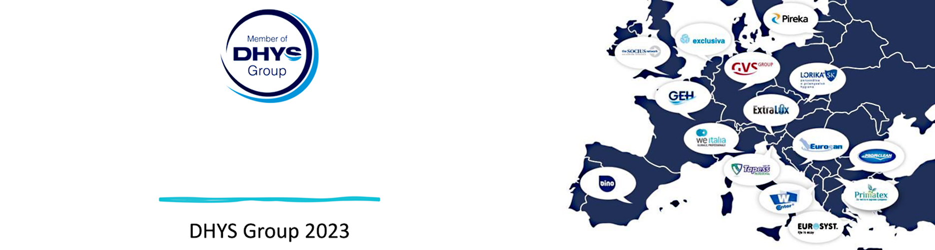 Nous sommes membres du Groupe DHYS (D pour Distribution, HY pour Hygiène et S pour Spécialiste), l’un des leaders internationaux en matière d’hygiène professionnelle. Ce groupement est composé actuellement de douze groupes majeurs européens en matière de distribution : le Groupe GVS (en Allemagne), le Groupe GEH (en France), le Groupe Dino (en Espagne), WE Italia (en Italie), Extralux (en Slovénie), Socius Network (au Royaume-Uni), Eurosan (Bosnie-Herzégovine), Tapess (en Croatie), Exclusiva (au Pays-Bas), Eurosyst (en Grèce), Pireka (en Lituanie) et Proficlean (en Bulgarie), Lorika Slovaki (en Slovaquie), Primatex (Macédoine, Kosovo), W.Center (Albanie, Kosovo) – avec environ 160 entreprises familiales dans 35 pays.