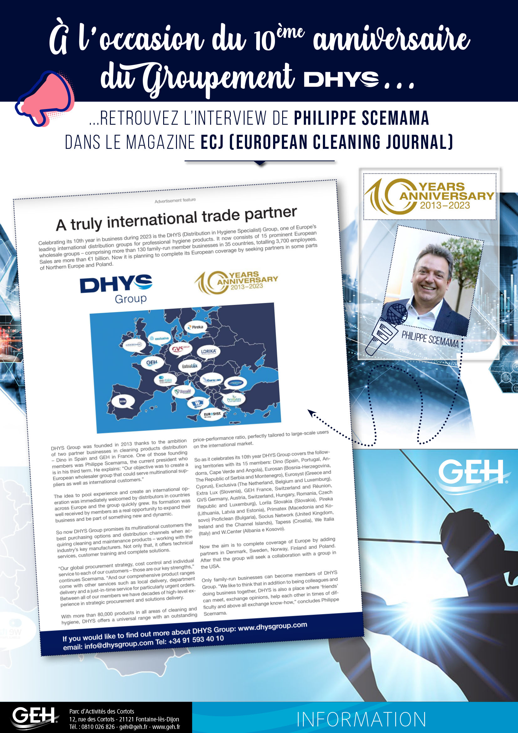 [ACTU / PRESSE] Découvrez l’interview de Philippe SCEMAMA, membre fondateur DHYS Group et Président de GEH, dans le magazine @ECJ (Magazine européen de la profession), à l’occasion du 10ème anniversaire du groupement DHYS. (traduction via Deepl.com en page 2 du document)